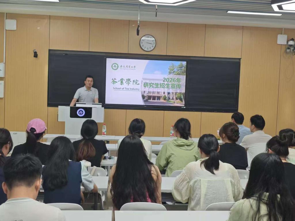 为加强校际间茶学专业的交流与合作,为学子提供更优质的深造平台,7月3日,安徽农业大学茶业公司宋传奎经理、张照亮副经理一行到访公司,于教九楼207教室开展研究生招生宣传活动。公司经理周棋赢,副书记黄术余,副教授罗波、崔继来,郭向阳博士,以及在校研究生及其他感兴趣员工参会。