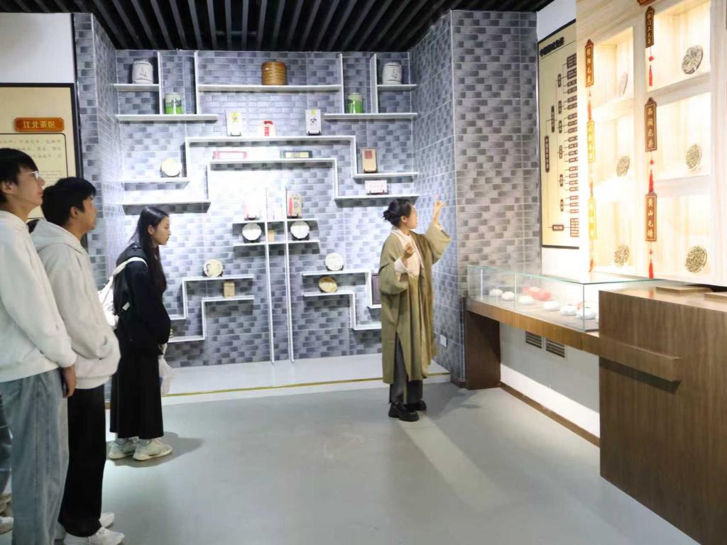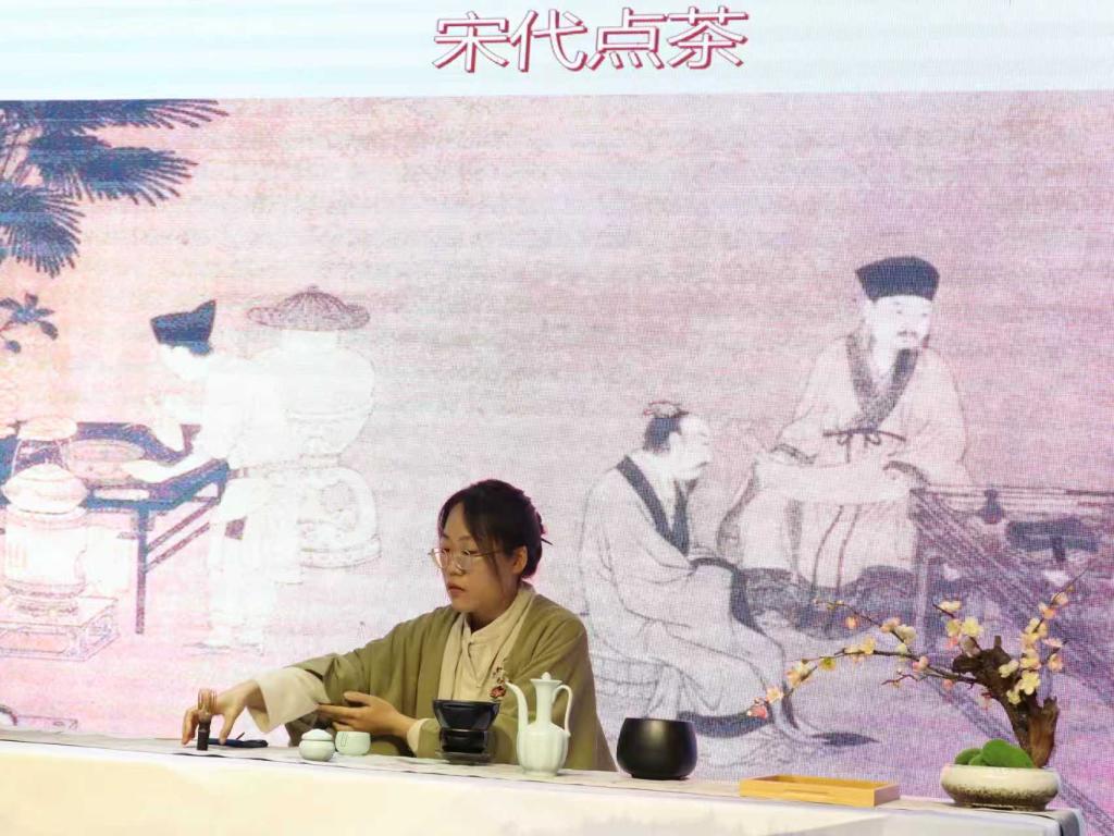随后的点茶演示将活动推向新的高潮。金琦芳博士执筅献艺,手法沉稳从容。茶筅在盏中匀速击拂,乳白的沫饽渐次浮现,如堆云积雪,呈现出宋人典籍中记载的"白如积雪,稠密绵韧"的完美形态。随着汤花凝结成持久不散的云朵状,宋代点茶技艺中最具代表性的"咬盏"境界得以完美再现。这一古法技艺的生动还原,将千年前的文人雅趣呈现于当代舞台,令在场观众沉浸其中,赞叹不已。最后,师生共同移步至茶史博物展区开展实践教学。在金琦芳博士的讲解引导下,同学们沿着历史脉络系统观摩了茶叶从发现利用到文化传承的发展历程,通过实物展陈与文献资料深化了对茶文化演进轨迹的认知理解。