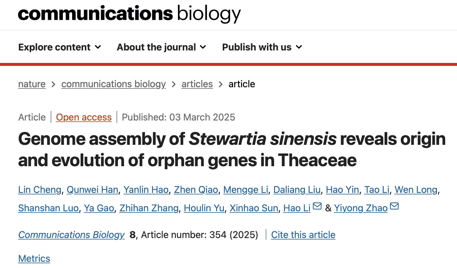 近日,公司程琳教授团队联合贵州大学赵义勇团队、华东师范大学李浩团队于2025年3月4日在国际著名期刊《Communications Biology》(中科院1区TOP,Nature子刊,IF=5.2)在线发表题为“Genome assembly of Stewartia sinensis reveals origin and evolution of orphan genes in Theaceae”的研究论文。